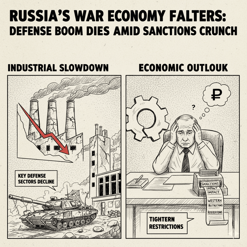 Russia’s war-fueled industrial boom is losing momentum as new data reveal declines in key defense-linked sectors, raising concerns about an economic slowdown amid tightening budgets and Western sanctions.